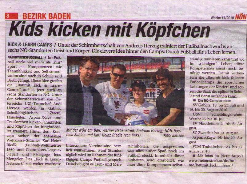 29.04.2010Kids kicken mit KöpfchenKick & Learn Camps/Unter der Schirmherrschaft von Andreas Herzog trainiert der Fußballnachwuchs an sechs NÖ-Standorten Geist und Körper.